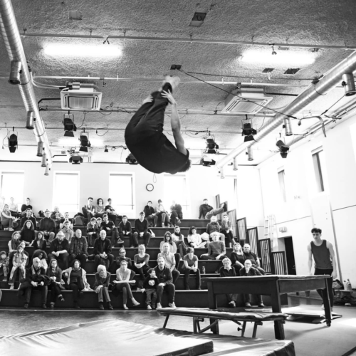 Bei HIT OUT wird das Seilspringen zum Rhythmusinstrument. Die Performer*innen zeigen eine energiegeladene Choreografie: Single-Unders, Side-Swings und Double-Unders verschmelzen mit Stimme und elektronischen Klängen zu einem hypnotischen Erlebnis. Die schnellen Seilschläge werden zum Ausdruck von Freiheit und Rebellion – es entsteht pure und mitreissende Energie.